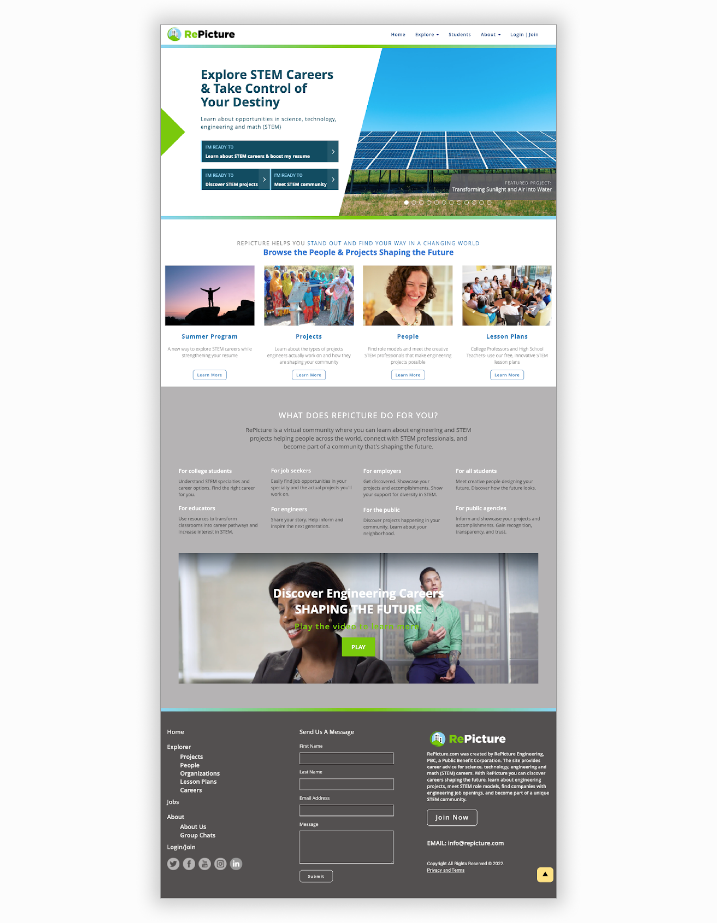 RePicture develops a career website that allows college students and high school students to explore career options within STEM, develop professional soft skills, connect with other STEM students and professionals, and showcase their skills and values through a RePicture profile.